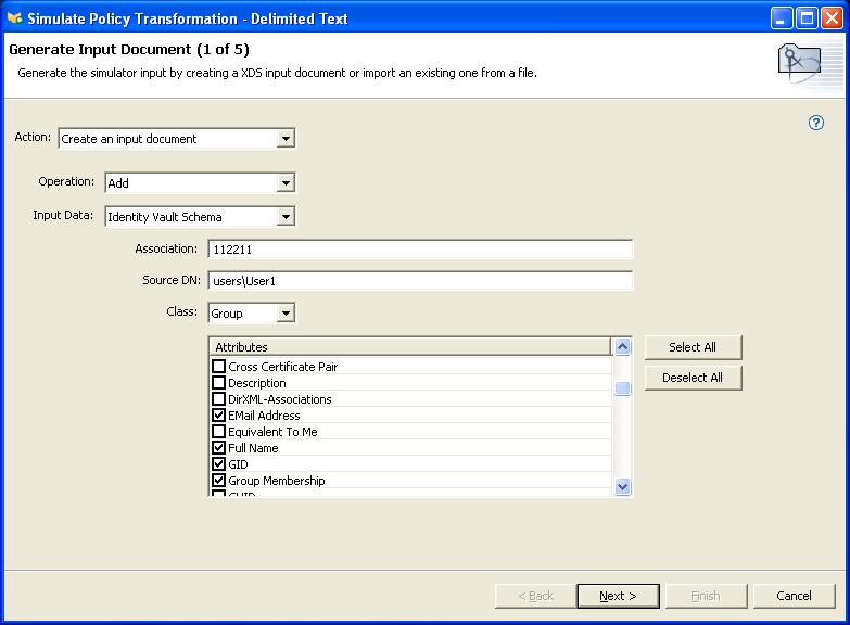 Selecting the next button will create an XDS Input document using the values provided on the page. Currently using these off-line methods a default attribute value is used and can be customized on the input page. Future releases of the simulator should allow the user to specify the attribute values in the attribute table. The following example shows the input document created using the Identity Vault schema class Group.