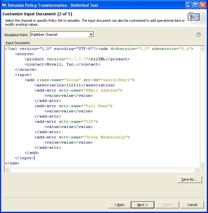 Depending on where a policy is being simulated the input document may need to be in the eDirectory or applications namespace. For example when simulating policies in the Input and Output policy sets the input document should be in the applications namespace. This means that the input document should contain the application class and attribute names. An enhancement to the simulator will translate the input document based on the policy set being simulated by automatically running the input document through the mapping policies. For example the following images show the translation of an input document when a user is simulating the policies in the Input policy set and the Publisher Command policy set.