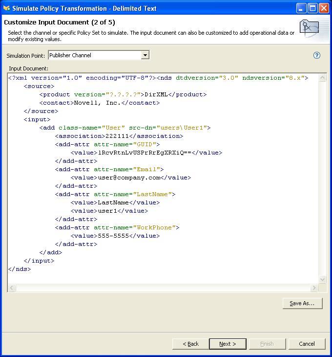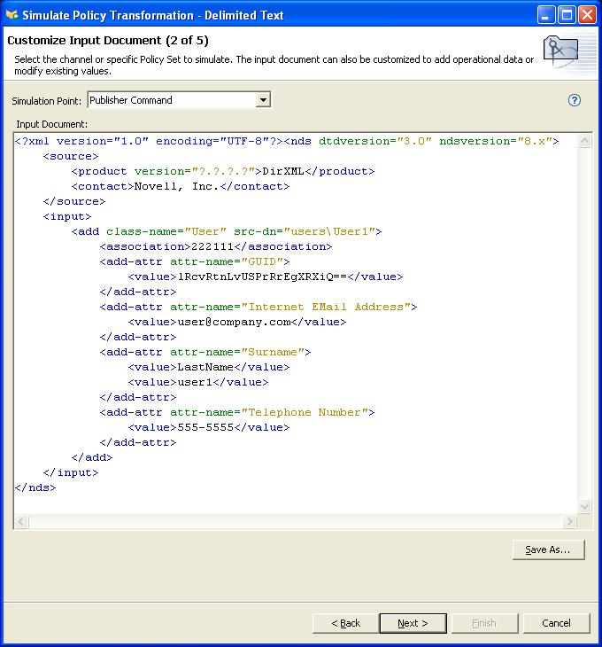 Notice since we are simulating the Input policy set the class and attribute names are in applications namespace. If the user selects the Publisher Command policy set from the combo box the simulator translates the class and attribute names into the eDirectory namespace. In this case the "EMail" attribute is translated to "Internet EMail Address" and "LastName" is changed to "Surname". Note however that the translation only handles the class and attribute names. If the values need to be in a different format the user must change the format manually.