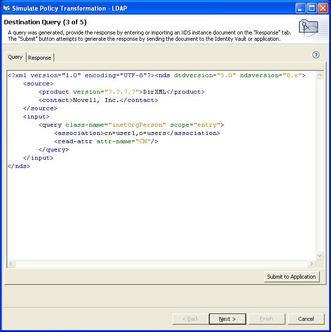 In this case the query was generated by the Destination Query process and is directed to the application. Selecting the "Submit to Application" button will send the query using IDS through the LDAP driver to the LDAP server. The response of the query will be generated by the Driver Shim. If the query is directed to the Identity Vault the button label will read "Submit to Identity Vault". The following shows the response generated for the above query.
