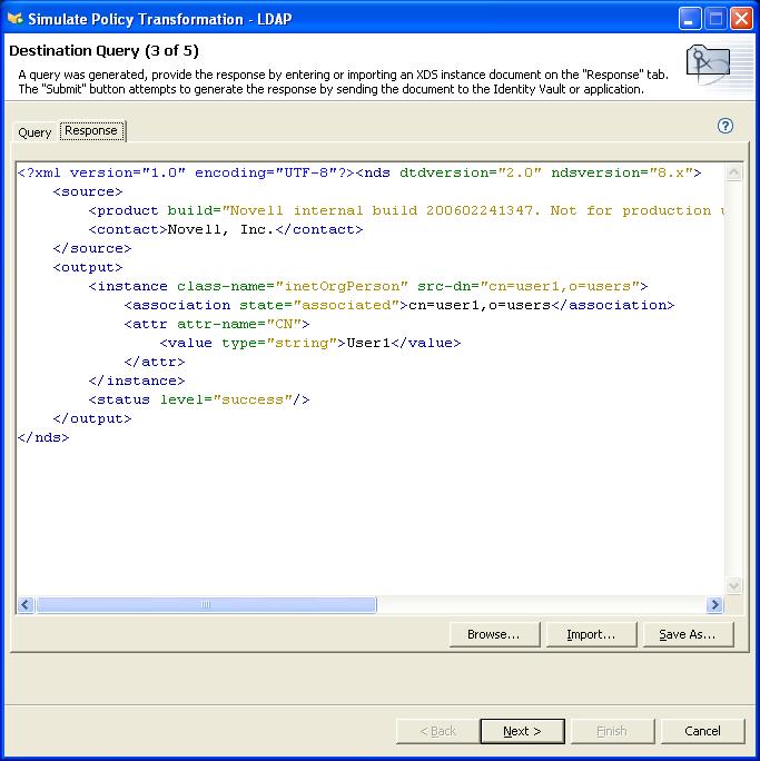 Enhancements to the simulator also allow the user to build up query responses by submitting the query directly to the Identity Vault or application through IDS. The user can still switch to the response tab and import a reply document from a file or enter the reply manually. The following query was generated by a policy simulation.