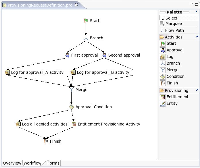For a complete exercise in modifying an existing work flow or creating a new one from scratch, see the IDM 3.0 Provisioning Request Definition Editor Quick Start Guide.