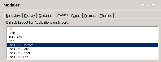 Layout settings determine how applications are displayed in the Modeler. To set a default layout when you import projects, select an option (for example, ).