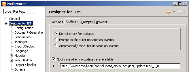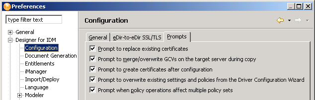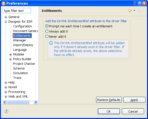 Controls whether or how often you receive a prompt whenever you add the DirXML-EntitlementRef attribute to a driver filter. The default is , but because this attribute is added only if it doesn’t already exist on the driver filter, you can select to not see the pop-up window.