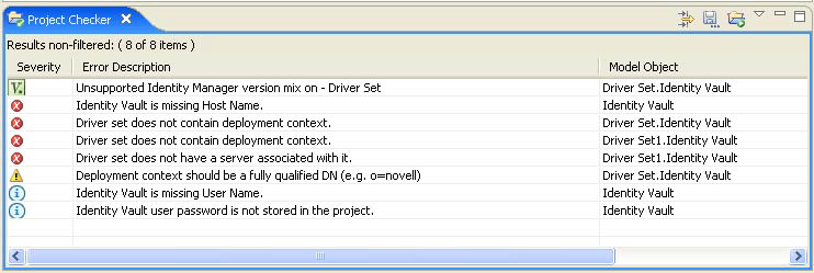 For example, for policy libraries to work, all of the servers on a given driver set need to be at the same Identity Manager 3.5 version. Project Checker catches problems like this where you might have an unsupported mix of servers. In this case, the project check results would look like the following figure: