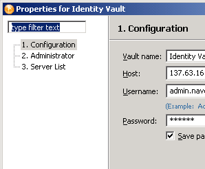 To view or change an Identity Vault’s settings, double-click the vault.The Identity Vault properties page has three options: , , and .