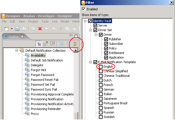 The install program installs all of the notification templates with Designer. However, templates are filtered out of the Outline view based on your workstation’s locale settings. To view and edit the internationalized template files, click the button in the Outline view, then select languages that you want to see. To eliminate the duplicate (_en) set of templates, deselect in the filter.