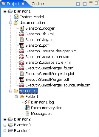 Shows all of the files that have been saved under the documentation folder. For example, under Blanston1 you see XML Source files (icon), PDF documents (icon), and the log file. In addition, Blanston2 contains a Document Generator style ( .docgen with the * icon) that can be used as a template for all documents generated, as well as PDF, RTF, and text files. Right-clicking the documentation folder allows you to: