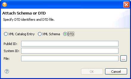 To reference a DTD on disk, choose DTD, then specify the Public and System IDs and the file’s disk location: