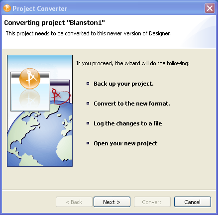 2. Designer opens the project in the Project Converter Wizard. Review the steps, then click Next.