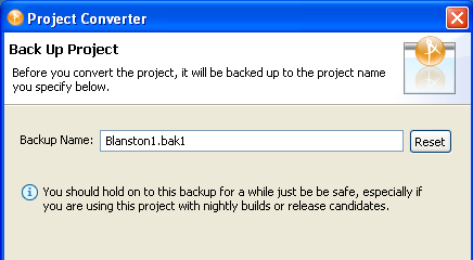 The Project Converter backs up your project before converting. You can accept or change the default name.