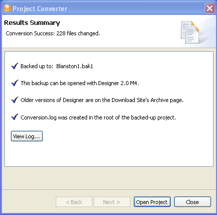 WARNING:The converter cannot convert Designer 3.0 M2 projects. Follow the information in the “Click here” portion of the No Converter screen to manually bring the old project data over to Designer 3.