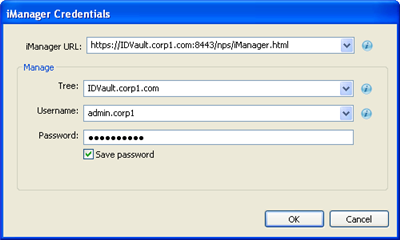 In the iManager Credentials dialog box, specify the appropriate iManager URL and user credentials to access iManager.