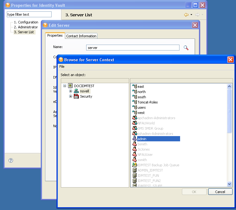 Solution: Verify that the server information specified in the Identity Vault properties page is correct and that the eDirectory server is up and running.