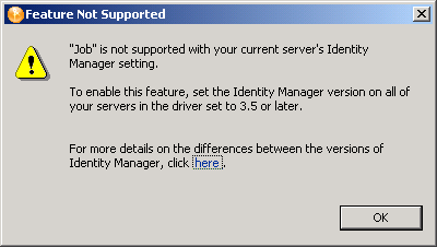 If you try to create an object that is not supported by your server version, a prompt tells you that this action isn't supported. For example, Identity Manager 3.5 introduces the concept of Jobs, Mapping Tables, and Policy Libraries. If you try to create one of these objects on a 3.0.1 server, you see the following message: