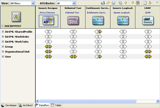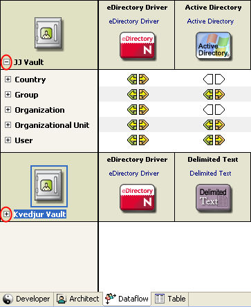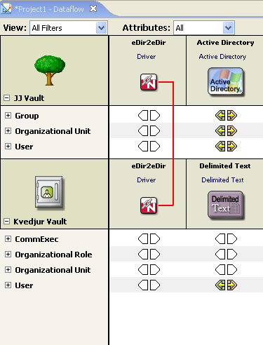You can easily view both ends of an eDir-to-eDir connection so that you can configure the dataflows on both sides. Designer automatically detects the two eDirectory applications and aligns them in the same table column. A red line connects them.