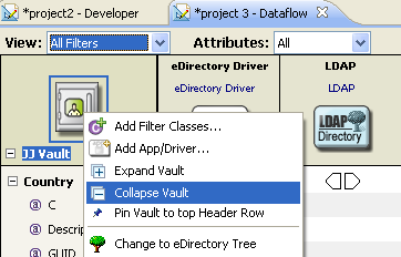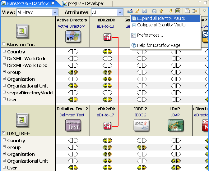 To expand or collapse the list of classes and attributes for all Identity Vaults, click the or from the pull-down menu.on the toolbar.