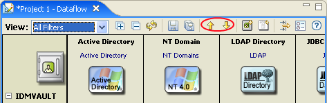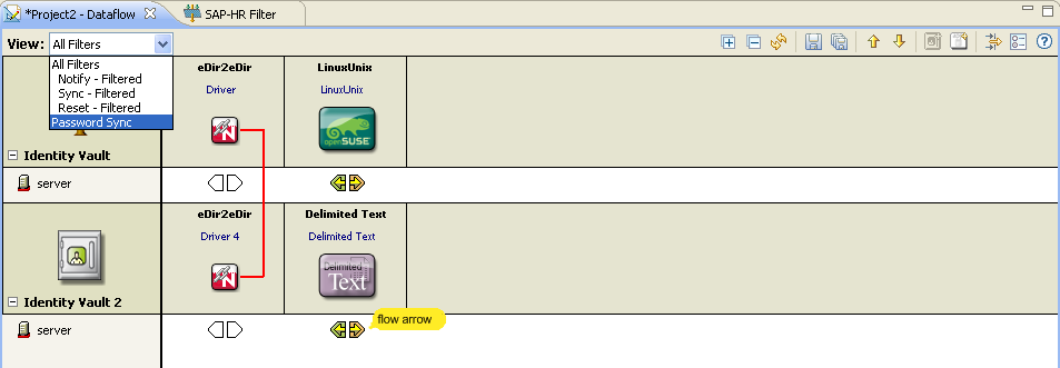 By default, the Dataflow editor shows all dataflows. The View drop-down list (in the upper left corner of the Dataflow editor, not in the Dataflow view), enables you to view notification, synchronization, reset, or Password Sync information. These filtered views do not allow you as much editing capability as the main view, but just what is necessary in that filter. For example, you can’t add attributes, vaults, or applications, because by default they wouldn’t appear in the filter.