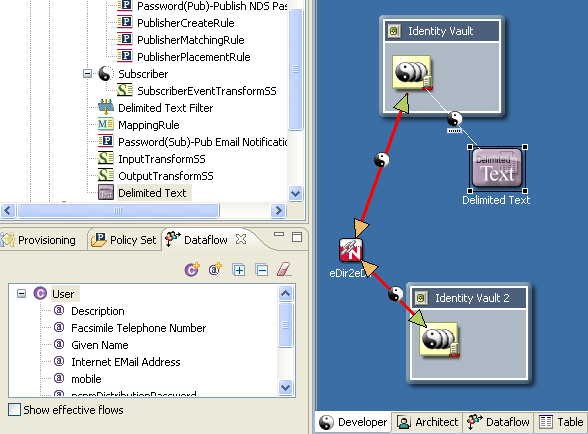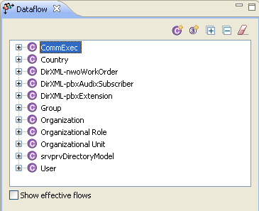 The following figure illustrates the Dataflow view. You can use it to control the flow of data between the Identity Vault and connected systems. The Modeler displays the dataflow.