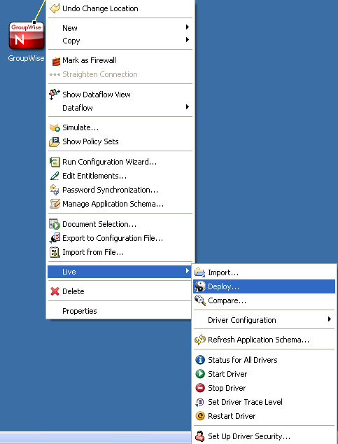 Suppose you finished a new driver object that you want to deploy into a test tree, or suppose you have imported a driver object, made significant modifications, and now you want to deploy that driver object back into its working tree. Use the following procedure to deploy an Identity Manager Driver object (and all contained channels and policies) into a driver set: