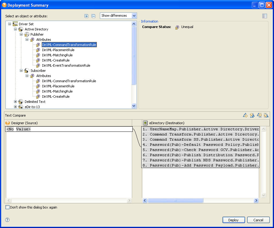 The Deployment Summary window shows you the differences between the objects you are deploying and those that already reside in an eDirectory tree. It is the same as the Compare feature. For more information on how to use the Compare window, see Section 14.7, Using the Compare Feature When Deploying.