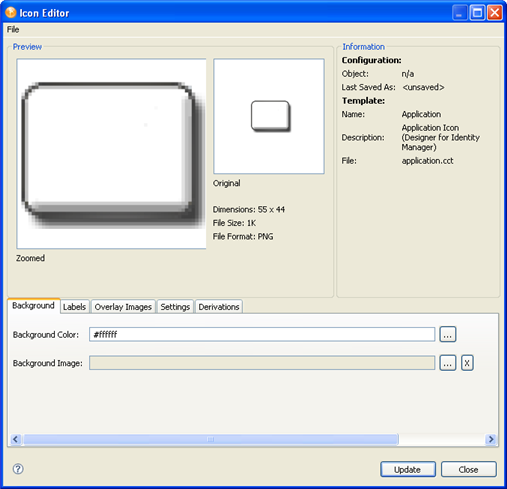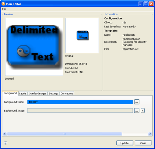 Background Image: Select a background image. If you select a background image, you can configure how the image displays by using the Settings tab, which includes controls for Brightness, Hue, Saturation, and Gamma. The Icon editor makes color changes in real time, so you can see the effect of your changes as you make them.