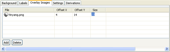 To select an image, select a cell in the File column. A small icon appears to the right of the file name. Click the icon and browse to the image you want to use as an overlay image.