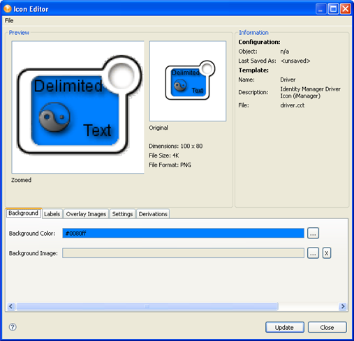 Background Image: Select a background image. If you select a background image, you can configure how the image displays by using the tab, which includes controls for , , , and . The Icon editor makes color changes in real time, so you can see the effect of your changes as you make them.