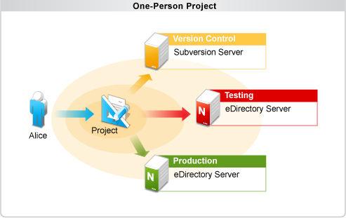 When they are ready to deploy to the production server, Alice updates her project to get the latest changes from version control and then deploys them to her development server. After she has verified that everything works as expected, she deploys the changes to the eDirectory server in the production environment. Alice manages all of the deployment to the production server to make sure it is a controlled environment.