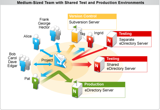 Alice, Bob, Carol, Dave, and Edgar all work together on a project. Frank, George, and Hector work part-time on this project and consult for other projects. Alice (the administrator) creates the project and checks it into the version control server. Bob, Carol, Dave, and Edgar import the project from the version control server and they all begin working on the project and deploying to the same eDirectory development server.