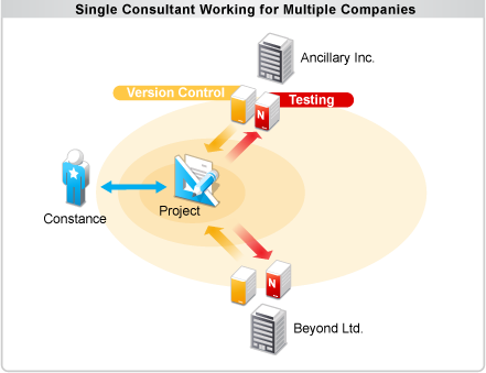 Constance (the consultant) works for multiple companies, helping them with their Identity Manager projects. On Monday, she works for Ancillary Incorporated. She imports the project from the version control server at Ancillary Inc. and deploys the project to the Ancillary development server. Constance communicates frequently with the Ancillary Inc. team members and makes sure to never overwrite the objects from the Ancillary Inc. team on the eDirectory production server.