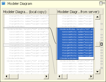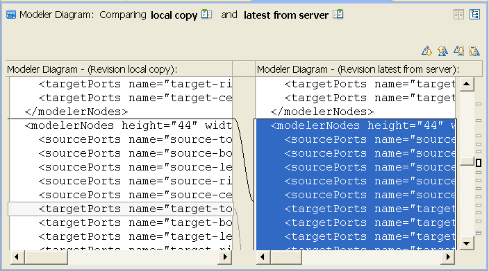 Version control uses a left-to-right display of information. The left side shows local copy information and the right side shows the version from the version control server. Because there is no information in the Outline view, you can double-click the tab to expand the view to fill Designer. Double-click the tab again to have it return to its normal size, or click the button in the lower right corner.