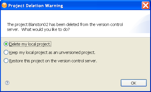 If the project has been deleted from the version control server, you are given three choices: delete the local project, keep the local project as an unversioned project, or restore the project on the version control server.