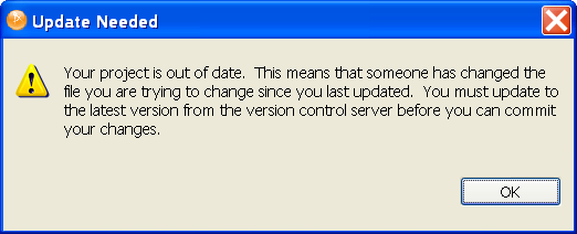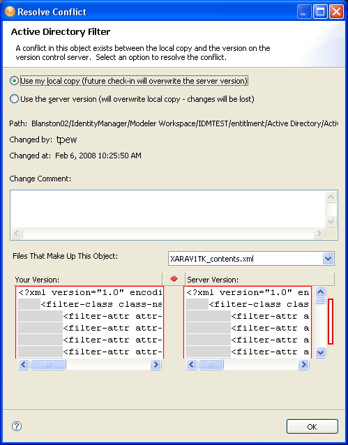 If she clicks and performs the update, version control tries to automatically merge the differences between Bob’s and Terri’s changes. However, if their changes cannot be automatically merged and Terri tries to update, she sees the Resolve Conflict page, allowing her to see the differences between her local version and the version on the version control server.