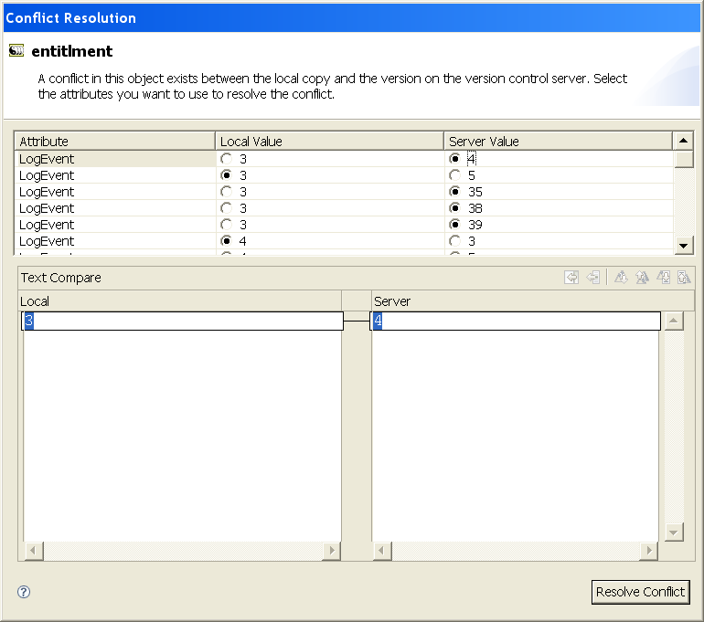 In some conflicts, the core model objects can merge manually at an attribute level, allowing you to change the attributes so that they are no longer in conflict. If the conflict is of this nature, you see the Conflict Resolution page, allowing you to manually resolve the conflicts.