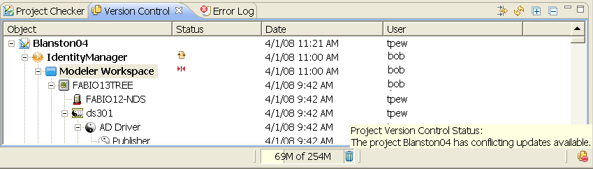 Suppose Bob checks in first. Designer is communicating with the version control server in the background and collects status information on all of the objects that are checked out. If there is a conflict, the icon changes to red and Terri sees a warning message when she mouses over the icon.