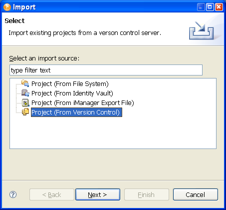 Designer’s Import dialog box lists projects and enables you to select projects that you want to import. There are a number of ways to access the Import dialog box in order to import projects from a version control server, and this example covers one of those methods.