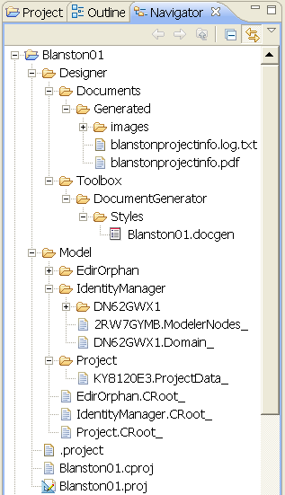The Navigator view enables you to manage and view the file resources that are in your workspace. You can see your projects and files as they actually exist in the file system. You can add files and folders, and append them to your projects or workspace. These extra items won’t change or affect the behavior of your Identity solution. However, they enable you to conveniently append other pieces of information that you want to associate with your projects and workspace.