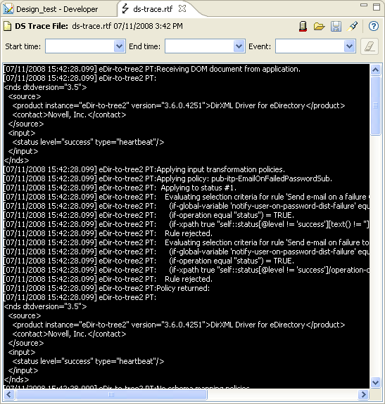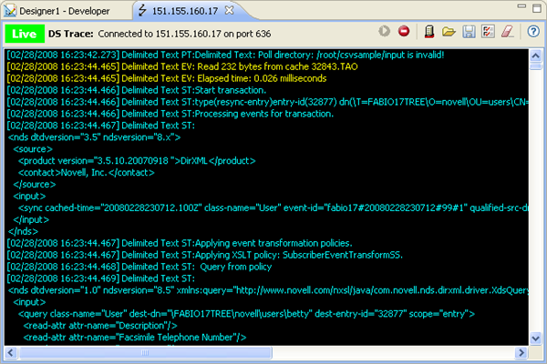 Designer provides DS Trace so you can monitor DirXML events in your Identity Manager environment. DirXML events constitute those events accessible by using the “dirXML” and “dirXML Drivers” switches in eDirectory’s DS Trace service.