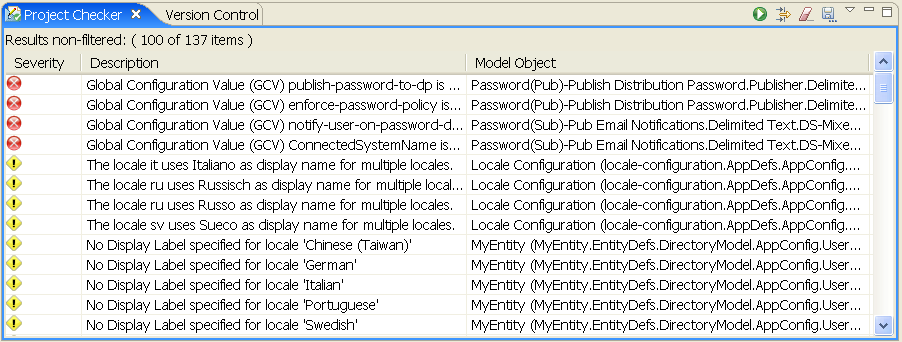 The Project Checker displays a list of versioning conflicts, errors, warnings, and information messages about the project. In the Project Checker view, you can do the following: