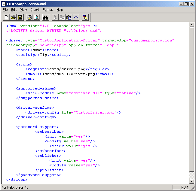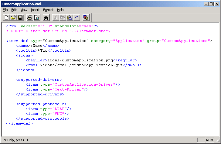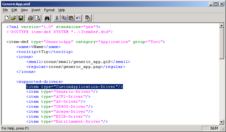 The easiest way to create the file is to copy an existing application definition file (for example, GenericApp.xml), rename the file, then modify it.