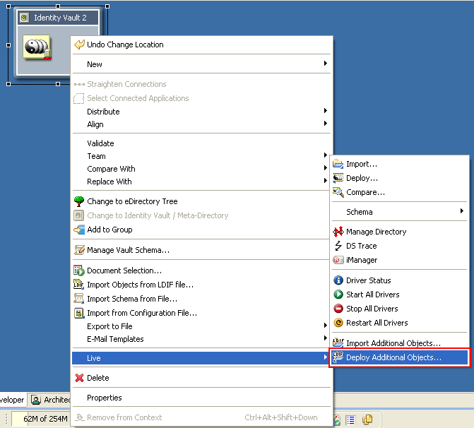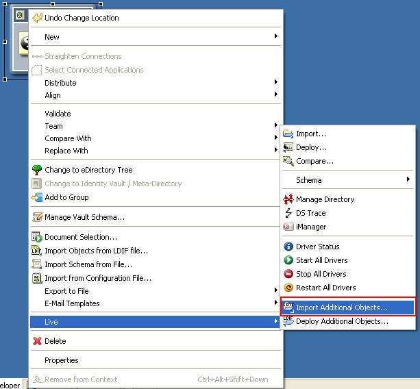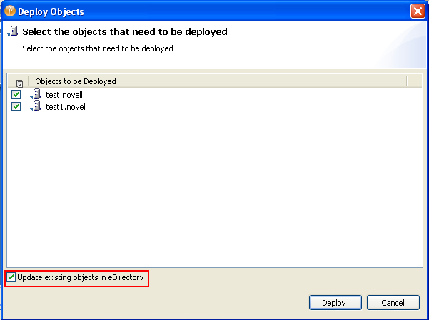 Designer allows you to update objects that are already present in eDirectory. The current functionality does not support the deployment of objects containing references to objects in eDirectory. To deploy these objects, you can either manually create the objects in eDirectory or remove the references (see Section 9.7, Editing the LDIF Container Data by Using an Editor). Designer allows you to update objects that are in eDirectory.