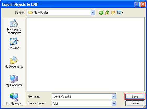 From the file browser that displays, specify the name of the file into which objects stored in the LDIF container should be exported, then click .