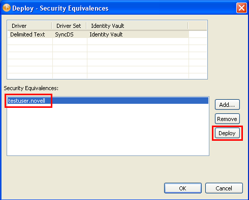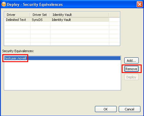 On the Deploy Security Equivalences page, select the Security Equivalences object from the list, click , then click .