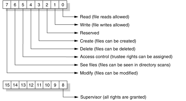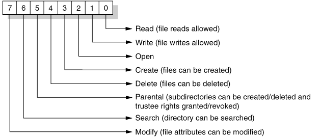 For versions of NetWare previous to 3.0, the trustee rights appear in a 1-byte format as follows: