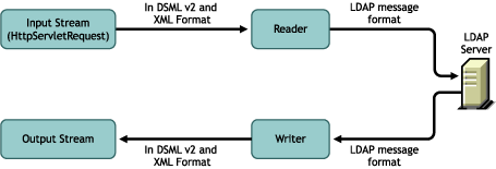 The DSMLReader class object takes the HttpServletRequest request as an input stream containing XML with DSML tags. It ignores all XML tags before and after batchRequests. All requests within batchRequests are converted into LDAP messages and sent to the LDAP server. The response from the LDAP server (in LDAP message format) is converted back to DSML tags using the DSMLWriter class object and the corresponding DSML tags are written back to the specified output stream.