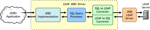 The architecture behind the LDAP JDBC Driver consists of the Java application, the JVM, the LDAP JDBC Driver, the network, and the LDAP directory itself. The driver abstracts the directory tree into accessible relational database tables, which hides the complexity of the underlying directory syntax. Information is selected and ordered from the relational tables using standard SQL statements embedded into the application.