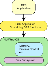 The following figure illustrates the DFS as it interfaces with the file system, applications, and other portions of the NetWare OS.