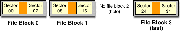 The following figure shows a file with 4 KB allocation block size and three blocks allocated (with hole):