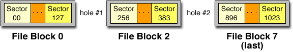 The following figure shows a file with 64 KB allocation and three blocks allocated (with hole):